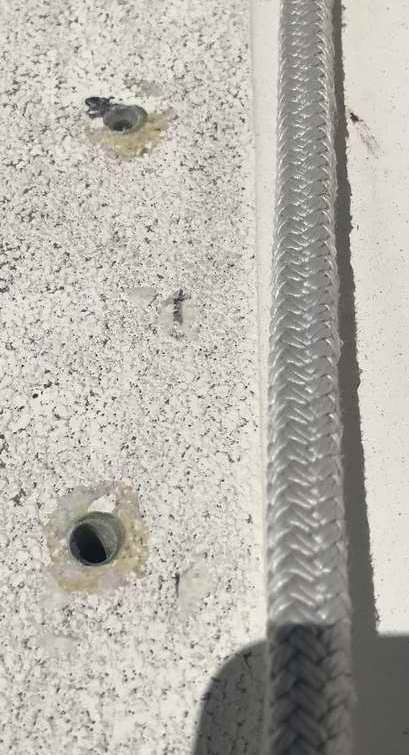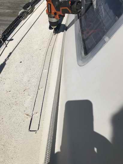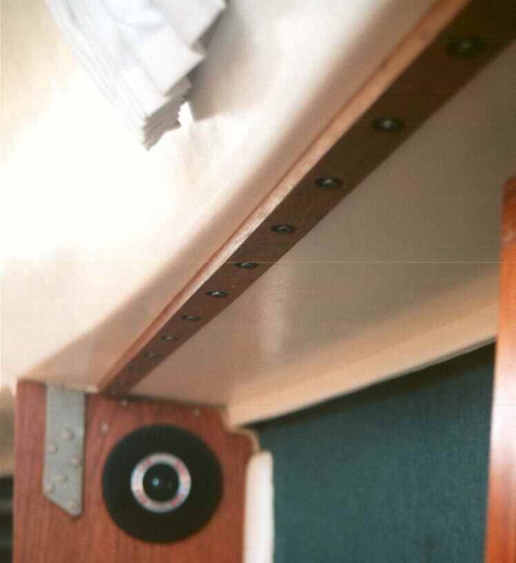 With this technique it is possible to reinforce the track on the inside of the cabin by through bolting it to a backing plate or grab rail. A shoulder height grab rail in the cabin is very useful in rough weather or to dry clothes after the rough weather!