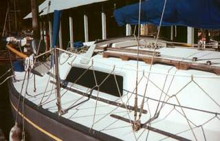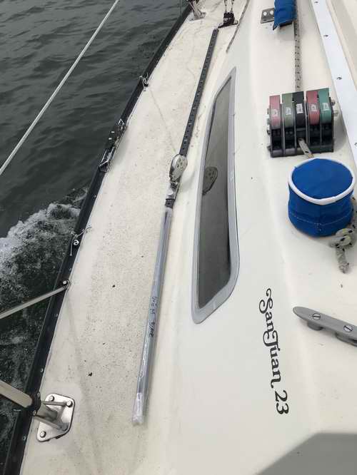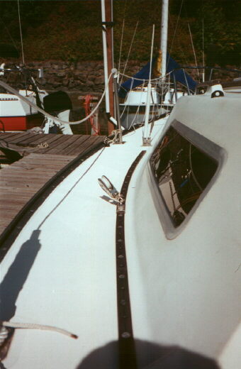 Anyway, a friend suggested I install the jib track on the side of the cabin, just below the window. This is the factory technique on his SJ28 as shown at right. Note that the