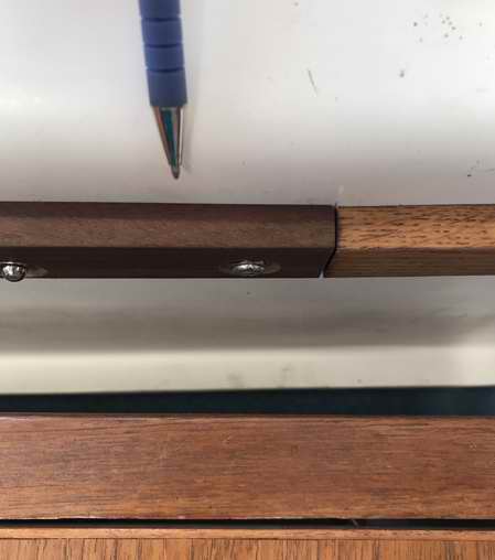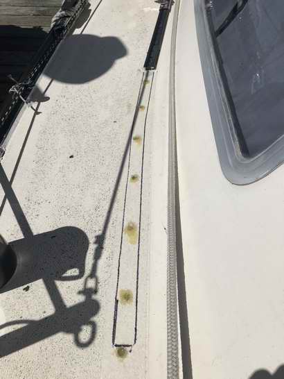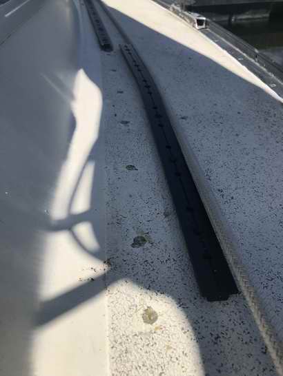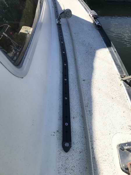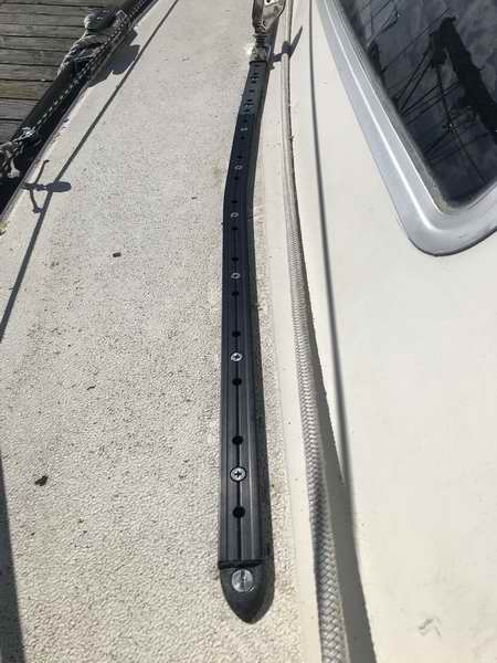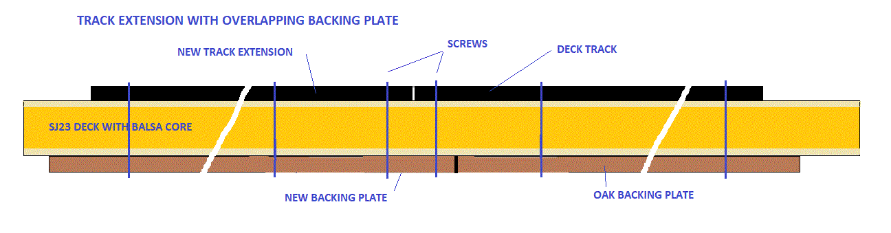 EXTEND A DECK TRACK (2024) - I've also seen long deck tracks consisting of two sections, Design Criteria - In 2024 I bought a full hoist 120% jib that requires a 6' long deck track to position the sheet block further aft for the correct sheet angle. I also need a longer deck track when I furl the 150% genoa and have to move the sheet block forward from the cockpit on to the deck track. I'm reluctant to disturb Panache's existing 4' water tight track, replacing it for a single 6' track. So for these reasons I added a 2' extension to the aft end of the existing track.