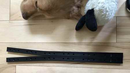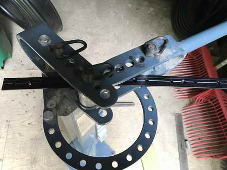 stressing the fibreglass. Bending along the short dimension is easy but bending along the long dimension can be difficult. The bend must have I step bent the track extension using a floor mounted Compact Bender shown at right. This is not exactly the correct use of this tool, but if you are careful it works. It required less effort than I thought due the leverage of the 3' handle with a built in 2' extension. But I did position the pusher pegs close together for the most mechanical advantage and the smaller bending radius. I pushed the handle with my hip to have lots of control and to closely monitor the bend. None of the anodized finish was damaged, which surprised me. Bending can be accomplished in several other ways: