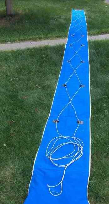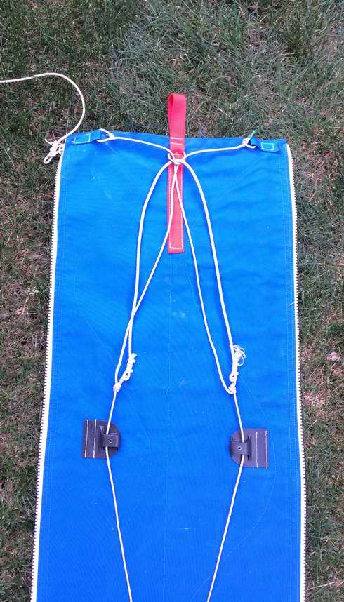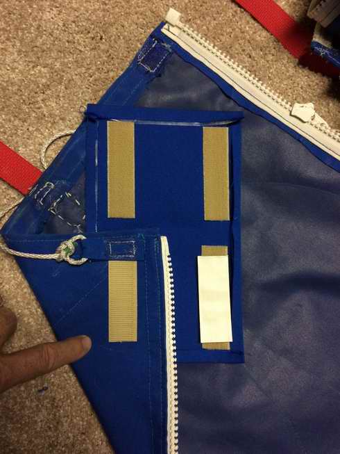 the front of the sleeve so the rest of the fabric hangs. It is important that the top strap is laid on the outside and the inside, then sewn to the cloth. This way it pulls the sleeve up parallel to the sail without gouging snagging the sail.