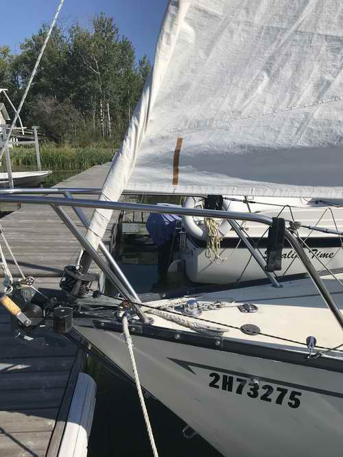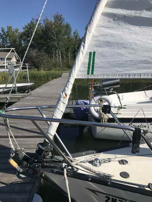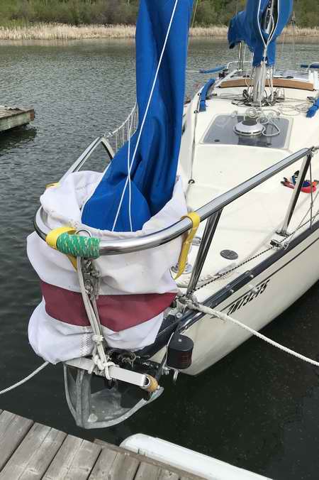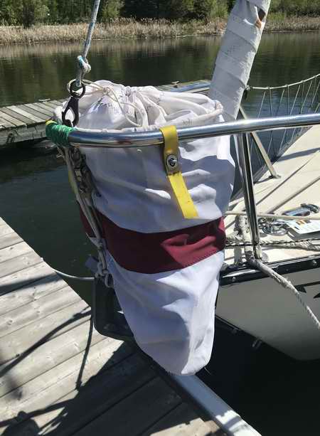 a repurposed spinnaker turtle launching bag slung inside the pulpit. The bag is equipped with a wire ring to hold it open
