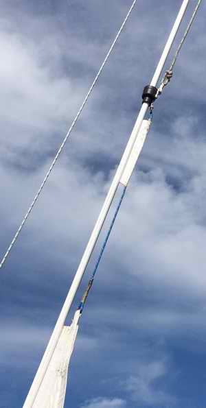 just above head height to photograph it for this Tech Tip. 2 - My jib sleeve occasionally snagged on the halyard bowline. Therefore the knot was replaced with a smooth stitch and wrap similar to the pennant at the head of the jib.