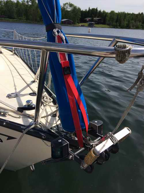 The repurposed "turtle bag" ready to accept the fan folded jib sleeve. I added 3 nylon straps with SS twist lock fasteners to temporarily secure the bag to the pulpit. They don't come loose.