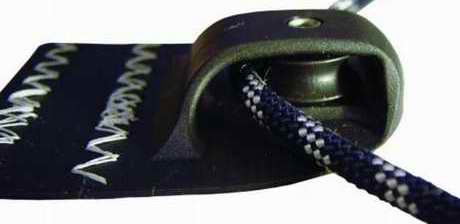 Marine proprietary blocks that afford minimal friction. When tightened, the 1/8" Dyneema lines grip the sleeve tight around the jib to prevent flapping. The free end of