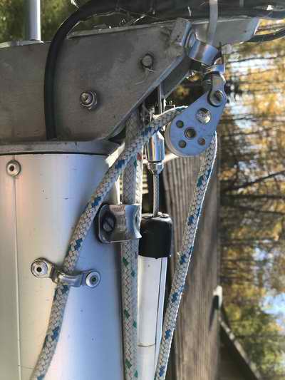 This is an external halyard with the aft line stored at the side of the mast and the free end stored on the pulpit, albeit tensioned tight when not in use. The spinnaker block is located right beside the top of the foil. The problem is that occasionally the aft line gets snarled or wrapped