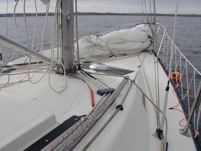 In the photo at right, the life line "netting" is made of 3/16" nylon tied between the deck and the lifelines using a reef knot. They prevent a sail or maybe a dog from going overboard. Tasha, our American Eskimo, made many trips to the bow after I installed the netting. She sensed the safety of it and I worried less about her. The orange lines are the 3/16" bungee cord that secure the jib against the lifeline. No, it can't hold a dog there! The bungee cord is tied to the toe rail and the two vinyl hooks are clipped to the life line for easy location. The use of a vinyl hook ensures it is rust free which helps to protect the sail. These hooks are available at a camping goods store or chandlery. The bungee cords need not be tight, snug is sufficient. The sail shown above is the standard 110% jib. ANCHORING CONSIDERATIONS - The foredeck of an SJ23 is a pretty tight space and a hanked on jib lying there will block access to the mooring cleats. Therefore I suggest you snap a loose bungee cord around the forward end of the jib and the top of the pulpit to keep the jib up off the deck. ROLLER FURLING - If you don't want to go to the foredeck then the alternative is to install roller furling. The beauty of this system is in the little effort required and short time it takes to douse the jib. Talk about looking cool. You don't even have to jump in the water to clean your sweaty body afterwards! A rolled up jib is probably the best method of storing expensive cloth, as long as the UV protection is rolled up to the outside of the coil. See Tech Tip F10. There are several considerations with roller furling:
