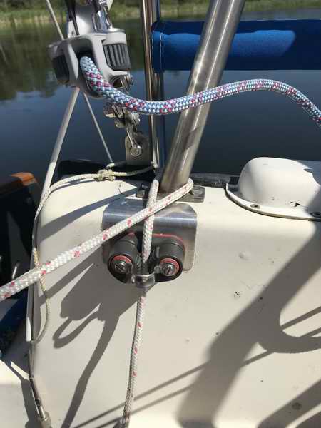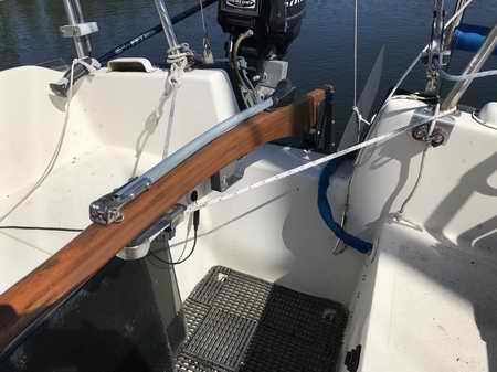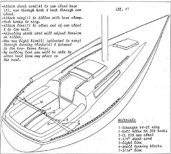 - "I tie a piece of scrap line across the cockpit, with one turn around the tiller. Tie one end to a