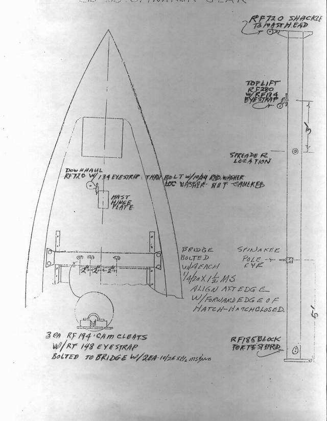 NOTE: Because of the poor quality of the original image below, I left the scanned file as full size. Spinnaker Pole Eye - A fixed spinnaker mast eye will likely not satisfy all sail requirements. Therefore it is advantageous to install an eye on a track. As a rule of thumb the spinnaker pole should intersect the mast at 90 degrees. The height of your spinnaker clew will determine the "sweet" point on the mast where the pole intersects at 90 degrees. From this point you have to consider how much adjustable range you need on the mast. This is usually about 3' long but if in doubt go to 4'. Then install the 4' track between 1.5' above the sweet spot and 2.5' below it. Remember to install the track end stops. Its real embarrassing to lose the ring from the end of the track.