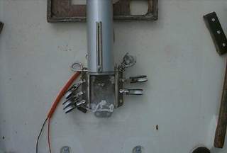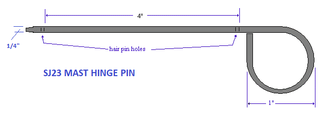 HINGE PIN (1990) - The factory hinge pin is difficult to insert through the four mast base holes or to remove it if they are misaligned. Especially so since there is no handle on the pin. For this reason I made a replacement pin from 1/4" SS rod. One end is bent back on itself to create a 1" diameter loop for easy control and the pointy end is tapered for easy insertion through the four holes.