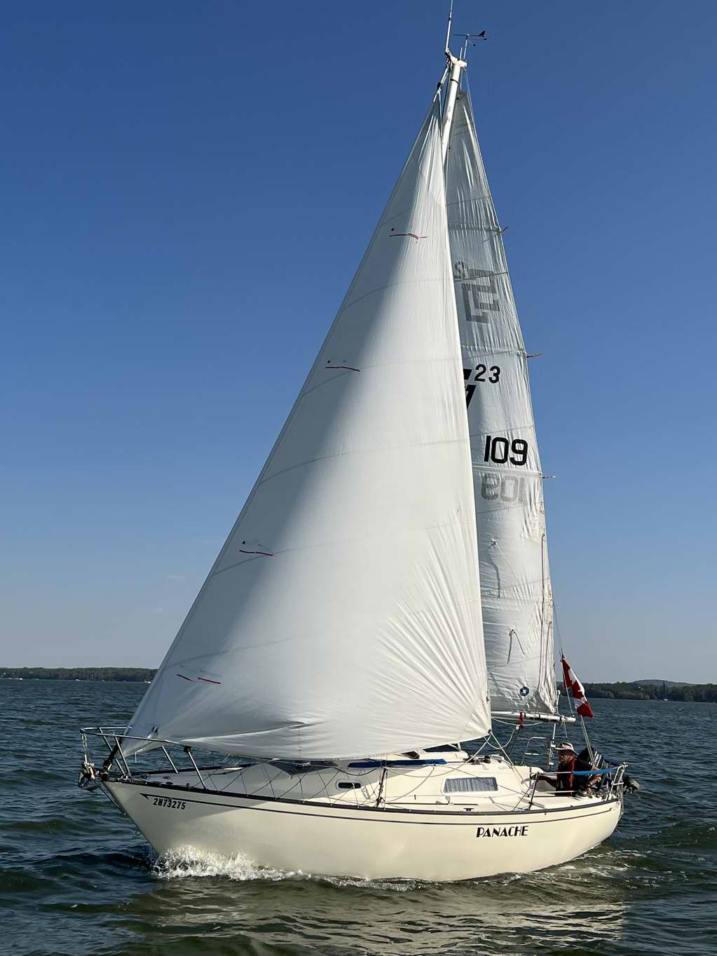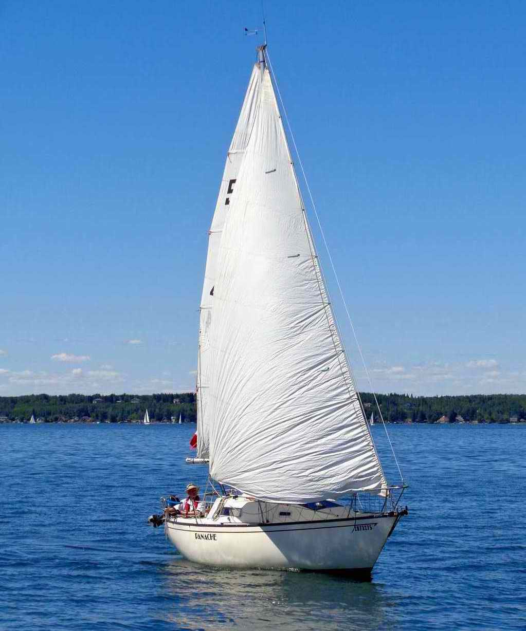 2019 - In Spring 2019 Panache's 110% & 150% jibs were modified to roller furling by the North Sails loft in Richmond, BC. They also repaired the leech of my genoa and added a foot tension line. I'm pleased with the results since they are now totally glass smooth (wrinkle free) and either one pulls Panache like a team of horses. OK, like a 426 hemi. I know, I'm dating myself. 2022 (After Furling, Below) - After years of trying to get together, my photographer friend returned for our "dance on the water" to capture this post furling photo for a comparison. It shows the improvement from a wrinkled sail with hanks above to a smooth sail with furling below. Its difficult to believe this is the same sail. There is barely 50 pounds pull on the jib halyard and the backstay tensioner is tight. I'm sailing at just over 6 knots and the wind was absolutely perfect that day with flat water. By the way, the genoa is just as smooth at 2 knots, but sailing at 6+ knots is way more fun. (Thanks Dave J). NOTE -