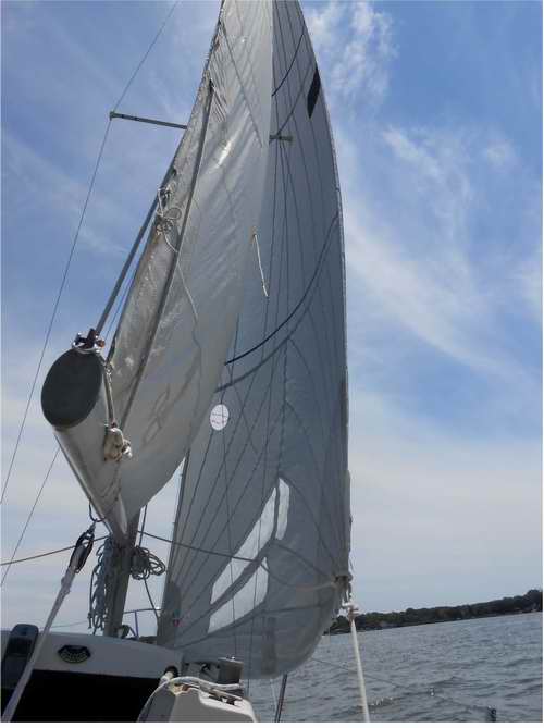 picked up this lightly used, 150%, Pentex/Mylar, genoa from a J24 for not much money. We didn’t even move the spreader-tip wear patch as shown in the photo. Also notice that the sail is a low-footed “deck scraper” that you might want for racing. Mike Raleigh. | |