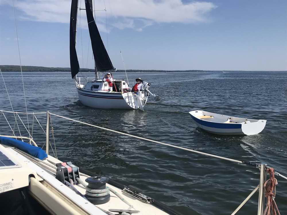 This time I caught up to my friends while they were cruising the length of the lake. I really wanted a closer look at their sails and the new dinghy they were towing. Turns out that Tim built this nesting dinghy. He later confirmed that it fits perfectly on the foredeck of his SJ23. Its always nice when a plan comes together. Click here for a closer view and details of the dinghy. | |