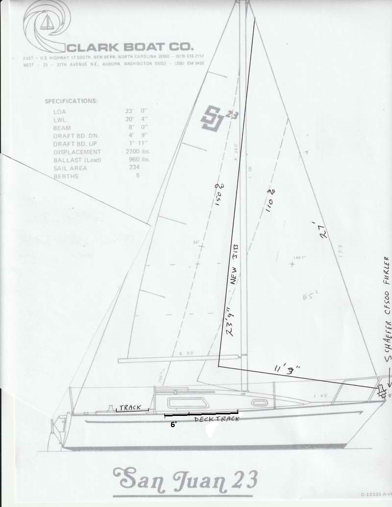 The folks in the J24 or any other fleet that has strong, active competition, tend to buy new sails when they think they are past their peak performance. Buying a used sail from them is cost effective even if it involves a bit of re-cutting. You can spend hundreds of dollars less. HINT: If you buy a genoa that needs some re-cutting, have them position the clew about 2' off the deck for a (140-150)% jib. What you get is a sail that twists less on a reach or when slightly eased. It also tacks more easily. Your sail maker can explain this. Glen Moore. Good Jib, Cheap - The fore triangle of a SJ23 and a J24 are the same size. A 150% Mylar genoa from a J24, shown at right, fits an SJ23 perfectly even to the point of using the existing block and deck track. Both sails use piston hanks on the forestay. We