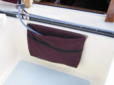 ......" Betsy Schultz The cockpit of an I.O.R. designed boat is narrow to favour the rule ratings of the early 1970s. The narrow transom automatically reduces the reserve buoyancy (load carrying capacity) of the stern, making for sensitive fore/aft hull trim. In some circumstances a narrow cockpit is a good feature as it stays drier than a wide one. Best of all, the boat has a better chance of remaining at the surface in a knockdown because the low side of the cockpit is higher above the water. It is also easier to brace yourself to the opposite bench using your legs. On the other hand it is easier to swamp the cockpit with a huge wave over the stern. But never mind, you're not sailing in the Southern Ocean! However, the things you have to deal with in a cramped cockpit means that anything lying about is clutter which is a dangerous tripping hazard, regardless of how few people are in the cockpit. Carry a few novice sailors on board and you'll see what I mean about the cockpit being small. They'll be in the way most of the time because they haven't learned where to be useful or how to stay out of the way. A - An SJ23 is not that big a boat, despite what the brochures will have you believe, so you have to make efficient use of every bit of space there is, especially in the cockpit. Before I had a mainsheet storage bag on Panache I flipped the mainsheet into the cabin simply to clear the cockpit floor of another line to roll under your feet. This works OK if a line doesn't snag on something down there or until the weather or sea state demands sailing with the companionway drop boards in place. MAIN SHEET BAG - The maximum size bag for an SJ23 is (20.5 x 8)". This will cover just about the entire front of the cockpit and allow you to store your binoculars or other valuable stuff as well. Just remember to remove your stuff when it rains or after you arrive at the dock!