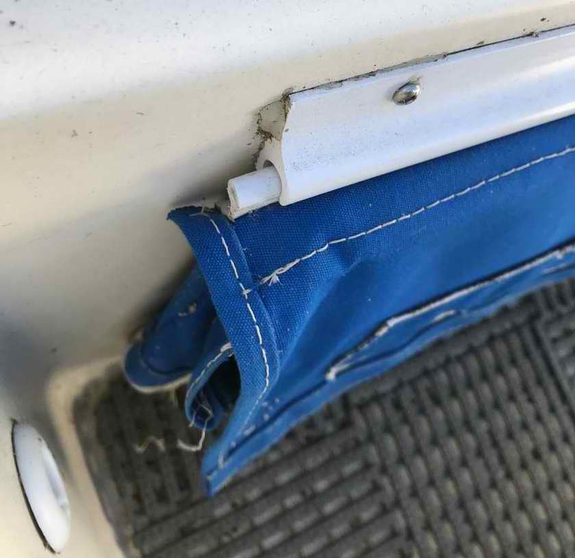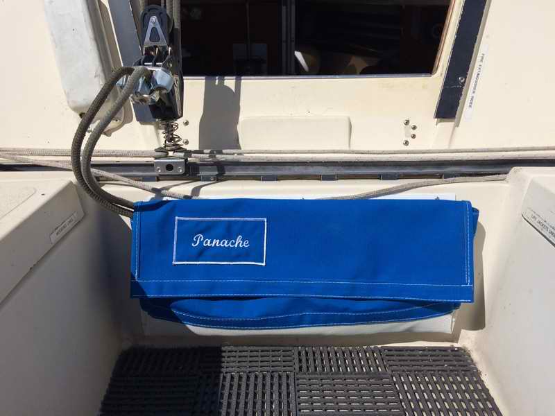 I took some designs elements from this bag and made a mainsheet bag from Sunbrella with a phifertex net (a vinyl mesh) at the bottom to let water drip out. It also has a flap at the top to keep the weather out, (should I ever store stuff in there!). The bag is hung from a white vinyl trailer awning track that is screwed and glued to the cockpit wall just above the bag. The awning track has a round slot, similar to the kerf on a mast, that receives the mating vinyl "bolt rope" sewn to the back of the bag. Simply slip the flexible "bolt rope" inside the rigid awning track to hang the bag. Slick and neat without a visible means of support. Below is the bag installed with line stuffed into it. (Order from Sailrite: awning track flanged white #103334, awning rope white vinyl #1371).