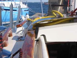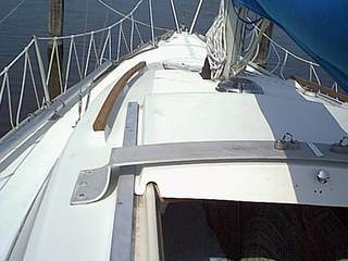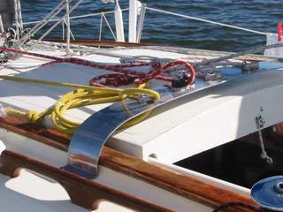 ![]() This bridge is made of 1/8" thick by 4" wide stainless steel sheet metal. The curve is probably best made with three rollers, adjusting the tension between them as the bend tightens towards the ends. The ends are through bolted to the deck. Saturate the balsa core deck around the mounting bolts with epoxy to prevent crushing the otherwise soft core as there will be considerable stress on these bolts from the halyard tension. As always, use a good marine sealant to prevent water ingress. Mounting a cleat or winch to this bridge requires a sealant under it to prevent marine growth. See Tech Tip G08. One of the nice things about a bridge is that each cleat can easily be labeled for those sailors unfamiliar with the control lines on your sailboat. Great for quick familiarization. This bridge also allowed the owner to install an extra hand rail further aft along the cabin roof.