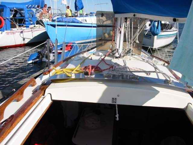 The later production boats could be equipped with a bridge to create unobstructed access for the companionway. I think the aluminum bridge shown at right is the factory version.