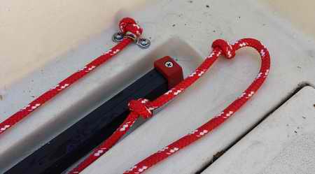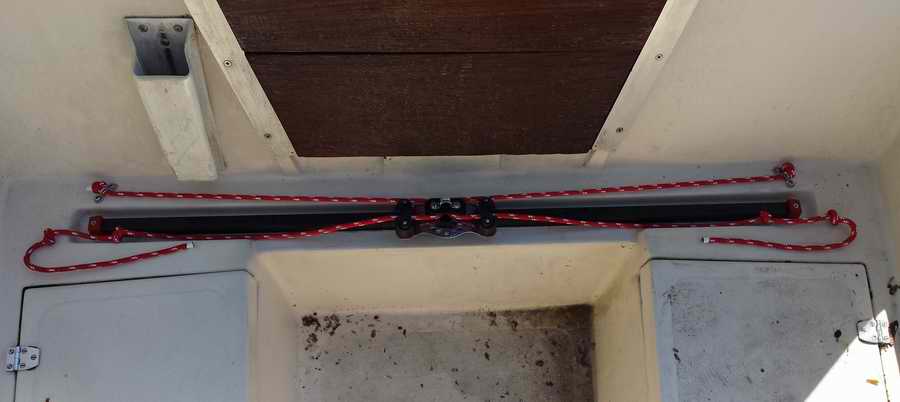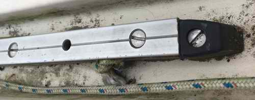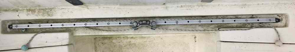 INSTALLATION - The first task was to remove the old track. The counter top prevents access to the nuts on the inside of the hull. Removing the counter is easy with the removal of 4 screws on the lower inside edge. I then disconnected the sink drain hose so I could move the counter out of the way. All the screws holding the old track were removed. I found that on my hull, the screw holes were not in the center of the track recess. The new track and car need to be perfectly centered as it is a very close fit. So, I drilled new holes for the new track. I ended up ordering 5mm bolts and locking nuts online as my local hardware store did not carry anything close. Since the bolts were thicker/longer than the original, I removed the teak edge at the back of the counter as it was not visible anyway. I then cut a couple notches in the edge to accommodate the new longer screws. I used butyl rubber tape under the track. I used ¾" sheet metal screws to attach the eye straps as the hull that is about 2" thick at that point. I used 5/16” line for the traveler. Notice the stopper knots to create a tail for grabbing line.