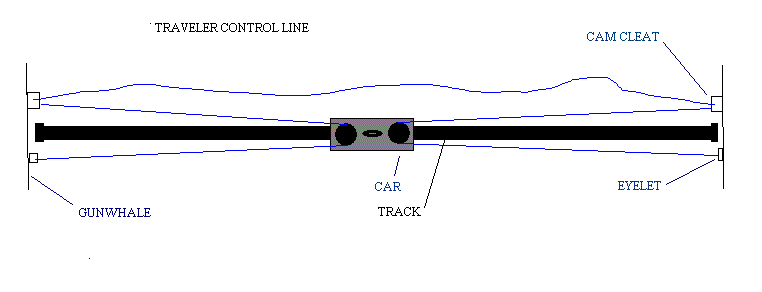 The 5/16" control line is spliced to the starboard eye strap. It then goes around the mainsail car turning block, back to the starboard cam cleat, up through the cam cleat, across the cockpit to the port side, down through the cam cleat, around the port block on the mainsail car, and finally back to the port eye strap where it is terminated with a splice. Leave about 1' of slack to operate the control line. This shouldn't foul the car. But if it does, then hang the slack in the cockpit foot well. The amount of slack you feel comfortable with is probably determined more by your agility and the requirements of your sailing than anything else. The tensioned portion of the control line running along the track is low enough in the track recess that it isn't a tripping hazard. The loose portion of the control that is between the two cam cleats is shown forward of the traveller (cabin side) to separate it from the mainsheet. This helps to minimize tangles. You can always reverse this to meet your needs. The control line is 15' long, 3 times the beam of the cockpit.