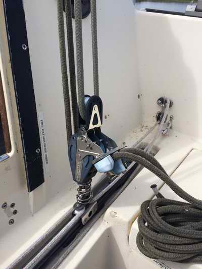 The line could be spliced at the ends to create an endless sheet but I have never done that. By the time I acquired Panache the line was too old to splice. The bottom block is supported by two Harken springs to
