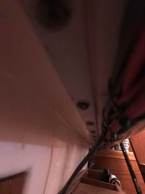 TOP SEAL THE TRACK TO THE DECK - While I changed the control line I also resealed the leaky track mounting screws. It was a difficult job in so far that it is awkward to access the nuts under the track. There are always other "things" in the way like the galley and the wiring under the companionway. I discovered that many screws were a different length due to the varying thickness of fibreglass under the track. Some were so poorly installed that they were at 300 off vertical. Others were bent inside the hole and difficult to remove.
