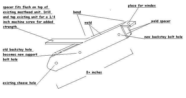 CONSTRUCTION - The extension was easy to build from several sections of 1/4" thick by 1.5" wide aluminum flat bar. The pieces were welded together for strength by a shop in town. One of the happy accidents of the existing masthead configuration is that the sheave hole and the backstay hole are roughly at 900 to the backstay. This means that a bolt-on extension would not require a longer backstay. If the new termination of the back stay is along the arc of the end of the back stay, then the length of the back stay remains constant. (Same radius). Since the top of the masthead fitting is slightly over 1.5" wide, adjust the width of the spacer accordingly. It will likely takes lots of dry fitting to get it right. A picture is worth a thousand words so I will stop gabbing now.
