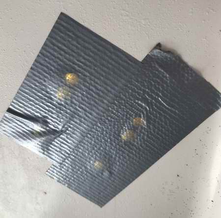 Fig 4 - Fortunately the sponge and pole held till the epoxy cured. Below is epoxy cured with the tape removed. Note how far the epoxy crept in only 10 minutes, prior to the tape being pressed against the ceiling. All the excess was picked off while the epoxy was still green, leaving a clean ceiling.