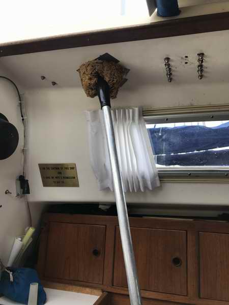 Fig 3 - The duct tape leaked and I had to think quick. So I pressed the tape against the ceiling with part of my favourite sponge and the mooring pole. Paper towel was on the settee to catch a drip.
