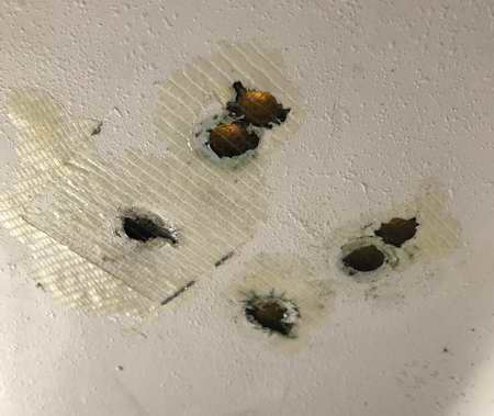 Fig 2 - The bottom of the holes were sealed with duct tape. The bulge shows where epoxy started to creep, alarmingly fast despite its thick viscosity.