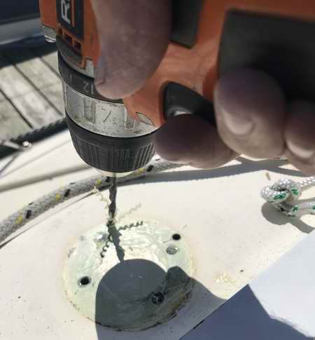 Fig 1 - Use the winch base as a template to locate the two outer holes. Sanitize all holes with acetone for maximum adhesion of the epoxy.  The winch holes were drilled 1/8" larger than the required 1/4" and slightly over filled with epoxy, creating a dome that was later sheared off flush with a sharp chisel.