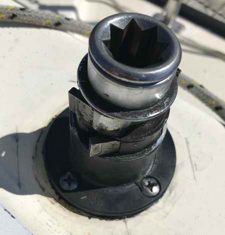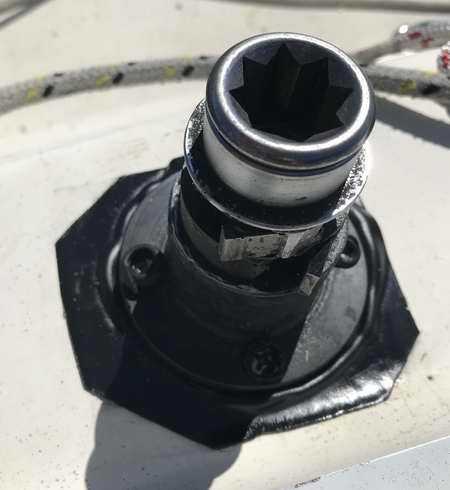 Fig 8 - The new winch securely mounted and sealed. It spins nice. All the winches on Panache are now Lewmar.