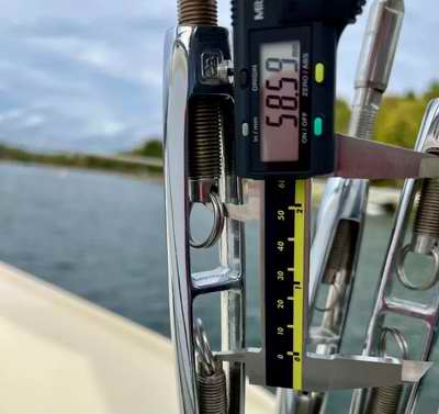 An equal amount must be screwed over the top and bottom toggles. Set Rig Tension With a Loos Gauge - "I have used a Loos strain gauge for all our sailboats. There are several models so use the gauge that matches the wire size on your boat. All Loos gauges measure strain to +5% accuracy. The PT-1 Professional gauge fits 3/32", 1/8" or 5/32" wire, which is suitable for the 1/8" wire on a MKI SJ23 or 5/32" wire on a MKII. The PT-1 Professional gauge can be used to continually measure the tension as you adjust a turnbuckle, making it much superior to the older A-91 gauge.