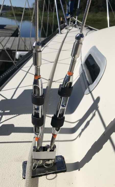 Hold the wire from twisting while turning the turnbuckle barrel. Final adjustments can be made while under sail which is most