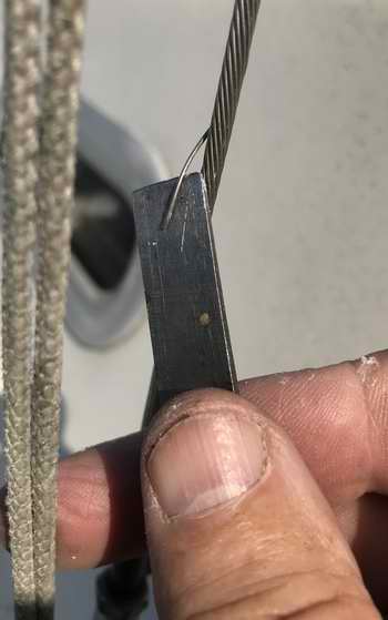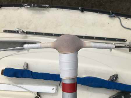 upper backstay, lower split wire, boom topping lift. Just after the split wire of Panache's backstay pulled out of its single Nicopress sleeve (holding the block n tackle at the bottom of split wire), it changed my understanding of the forces involved. After assessing the age (1977) of Panache's factory 1/8" backstay, I decided to replace it. 47 years is pretty good but nothing lasts forever. The upper part of the backstay was replaced with 5/32" wire to match the rest of the standing rigging and the lower split wire was replaced with 1/8" wire. It could be that I'm sailing Panache harder since upgrading to 5/32" rigging but that certainly wasn't the case when the split wire pulled out of its sleeve! Regardless, the backstay upgrade was relatively easy to do and I'm not about to loose the mast over a simple upgrade. See Tech Tip F09 for caution note that initiated this replacement and