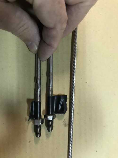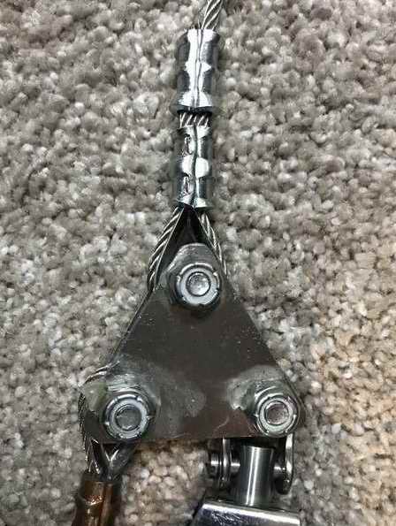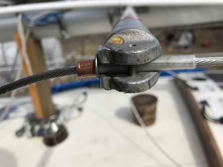 railroad track weighing it down. The worn swaged shrouds are on the inside and the new shrouds with Sta-Lok forks (top terminal) were set on the outside.