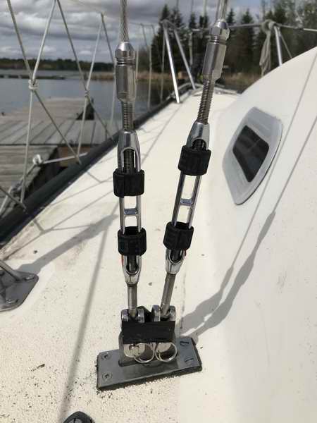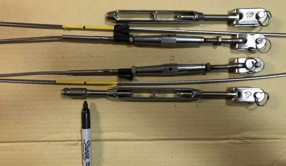 - Since the thread of the factory original 1/4" turnbuckles was too sloppy for my liking, I installed new 5/16" open body turnbuckles equipped with the stronger drop forged T-bolts. Then I used Velcro lock pins to lock the turnbuckles.