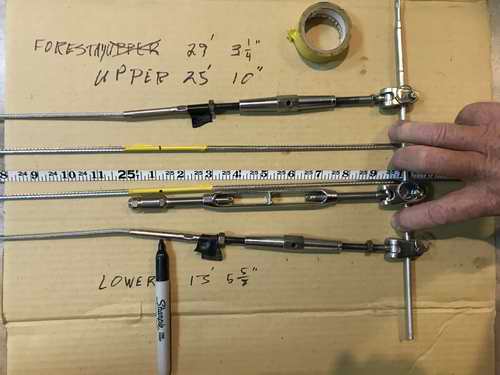 were tensioned to accurately measure their lengths. Always measure with a 50' tape. "And you thought the shrouds would be equal length? Guess again, 1/2"