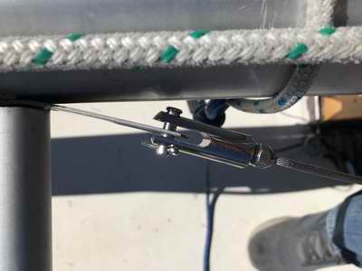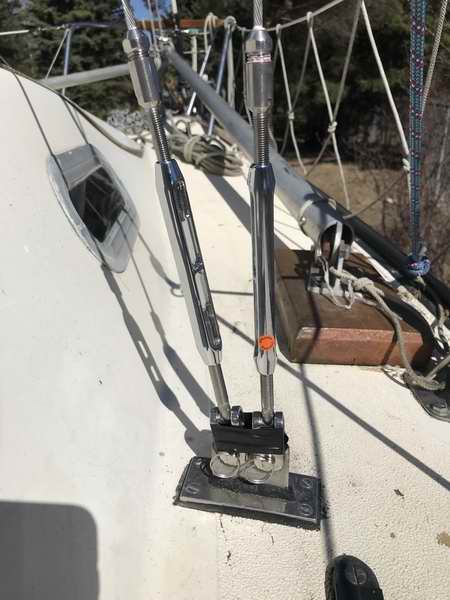 Installed a Sta-Lok stud to the bottom of each upper shroud. Then screwed a turnbuckle to each and attached it to its respective chain plate with a spacer tube over the pin. Tensioned the rigging really
