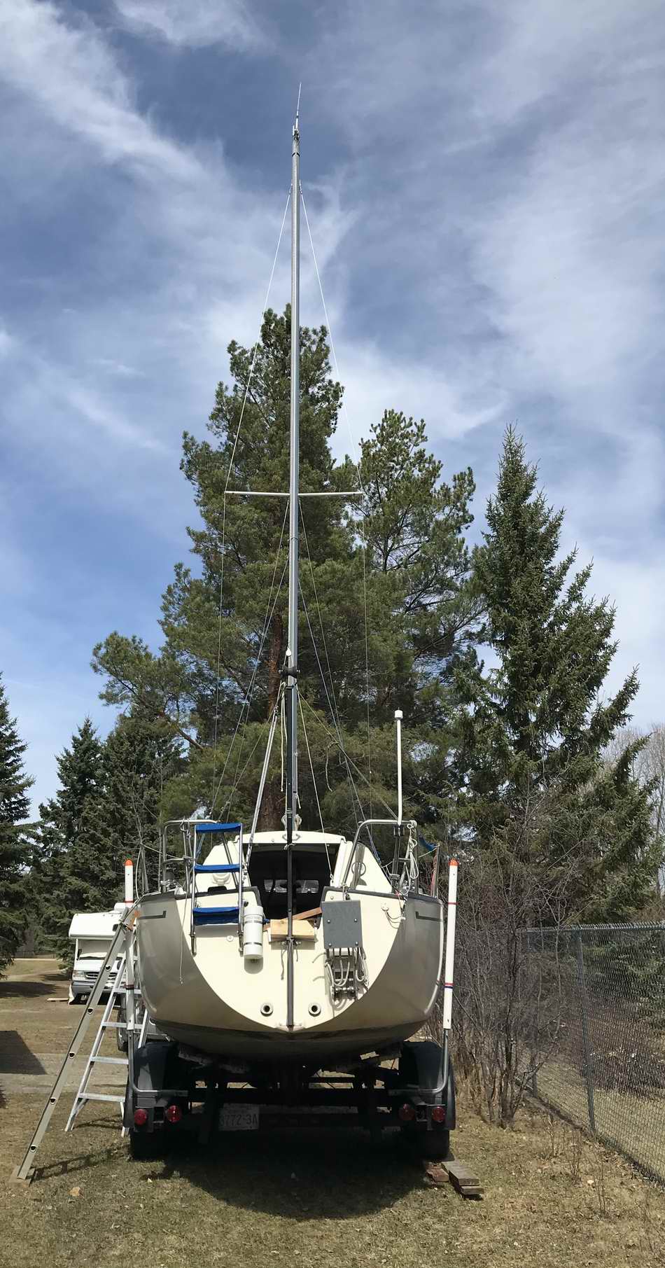 At this point in time all the rigging, except the backstay, is secured with a Sta-Lok terminal on 5/32" SS wire, I crimped the stopper sleeves under the spreaders, installed the spreader ends, locked the cotter pins at each mast tang, and greased the turnbuckles. Only the top of the backstay has a swaged terminal (factory original) and the open end of that terminal points down so I'm not concerned about it for now. I have enough 5/32" wire left to make a new backstay. Its a thing of beauty when a project comes together after so long. Time to go sailing.