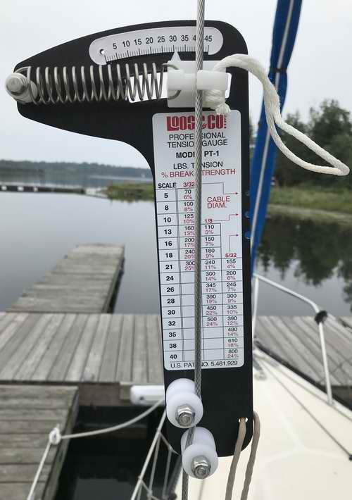 After setting the mast straight and adjusting the rigging tension we motored the length of the lake over flat water to Panache's slip. The rig adjustments were "tweaked" in the slip later that day using the Loos PT-1 tension gauge at right. During my first sail I cruised around at near hull speed for the afternoon, heeled at 200 for as much as possible. I was impressed with the lack of stretch the new 5/32"