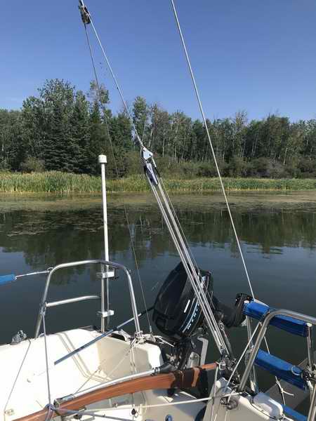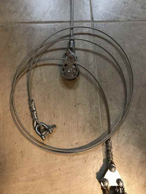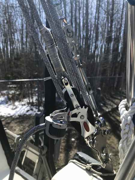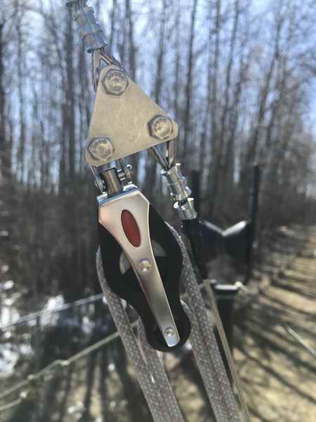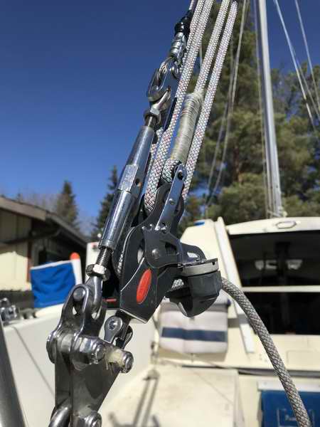 The whole assembly is strong enough to support the mast should the backstay break (it previously supported the mast when the shroud wire broke) or to lift a person out of the water. I hope I never have to do either of these.