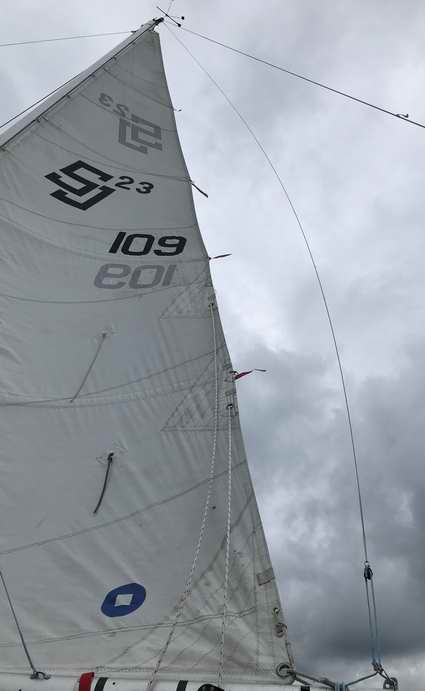 FABRICATE 5/32" BACKSTAY, (Fall 2023). The top wire of the new 5/32" backstay now has a Sta-Lok eye terminal at top and bottom ends. NOTE - This is one of those times when I received misleading information about the SJ23. Panache was still floating when I was told the masthead casting changed over the years and an early version may not accept an eye terminal. Obviously this is not the case as can be seen in Fig 14 below, but it is best to verify this against your own boat.
