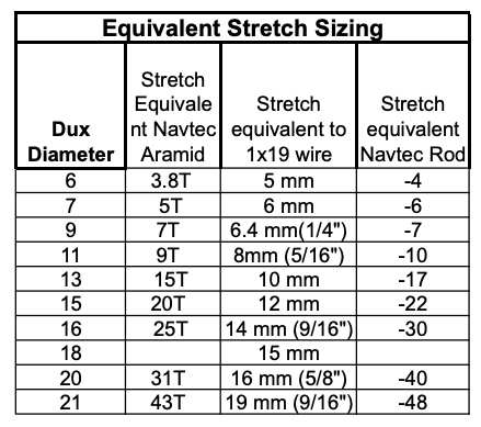 Hey there SJ23 crew! I finally got around to taking photos of our new standing rigging after we got the mast up on Goodpain. This is our progress at this point in time. I spend a lot of time around the racing community here and have some friends who work for North Sails, plus others who helped to build America Cup boats. I’ve long been convinced that Dyneema was the way to go for SJ23 rigging. I contacted John Franta, the owner of Colligo Marine, who helped me spec out rigging for Goodpain. We used 5MM Dyneema Dux (heat-stretched) covered with a Technora chafe sleeve from Premium Ropes. Covering the Dyneema is not normal practice. I have not found anyone who has fully covered Dyneema rigging with a chafe sleeve, although I’m sure it’s been done. The reason that it’s not necessary and difficult to do, is because of how compressed Dux already is. We decided to do it because we wanted graphite blue rigging. I mean,… come on,… it has to LOOK GOOD! In reality, Technora protects against UV damage and sail/sheet chafe. It could also be used to cover a length of Dyneema so a line locker can grip it. It should extend the life of the Dyneema shrouds. By the way, bare Dyneema is good for ~7-10 years according to John. Covered, as I’ve done, they should last as long or longer than the SS wire they replaced. DYNEEMA SPECIFICATIONS - In terms of sizing the Dyneema, you actually size it for the STRETCH, not the breaking strength. I noted from Tech Tip F34a that Bob chose to upgrade from 1/8” wire to 5/32” wire, so I chose to spec the Dyneema against 5/32” wire for comparison. 5mm Dux will stretch approximately 50% less under load than 5/32” (4mm) 1x19 SS wire, and has an ultimate breaking strength roughly 4 times higher (2,822 lb for SS, 10,472 lb for Dux)! The following 3 charts are from the Colligo Marine website.