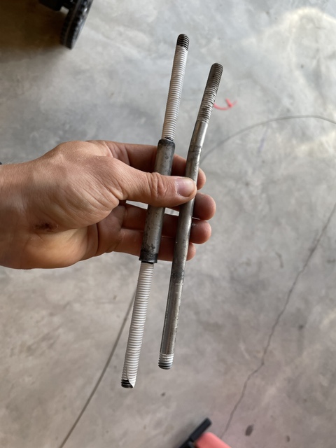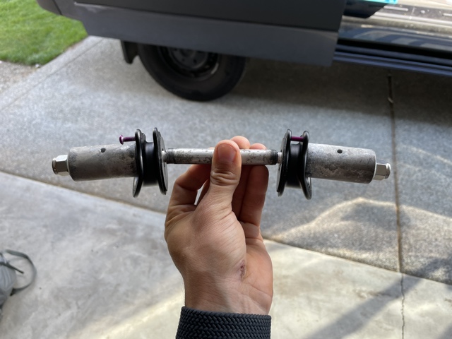 CHEEKY TANGS to CONNECT SHROUDS to MAST - Of course we had to convert all the terminations from wire to Dyneema. For the mast connections that meant using the Colligo “cheeky tangs” and using their knot-stopper terminators at the top of the chain plates. See photos below. By looking at their drawings online, I noticed that the cheeky tangs should be able to fit over the spreader bolt and that the spreaders should be able to butt up against the cheeky tangs! I removed the spreaders and mounting bolt with compression sleeve to replace the factory bolt with a longer one so the new cheeky tang connectors could fit. When I tested the assembly I felt hopeful! It’s gonna work! I straightened one end of the old bolt to remove the sleeve, wrapped the new bolt in electrical tape to electrically isolate the aluminum and stainless steel, then bent the ends of the new bolt to match the factory bends. As a side note, the bends in my original bolt were not symmetrical. I measured the angles with a digital gauge and the two sides differed by ~5 degrees. I'm blaming this on the previous owner. The new one is perfectly symmetrical.