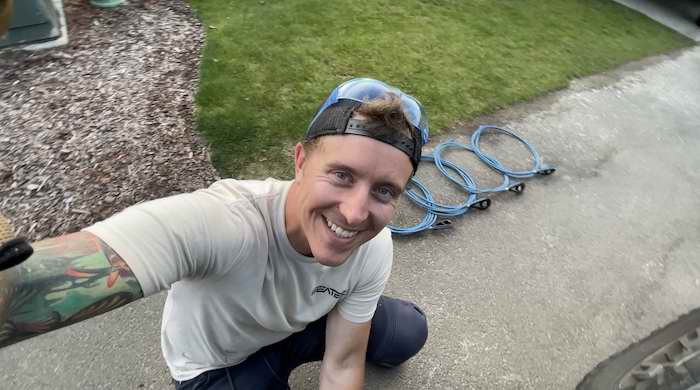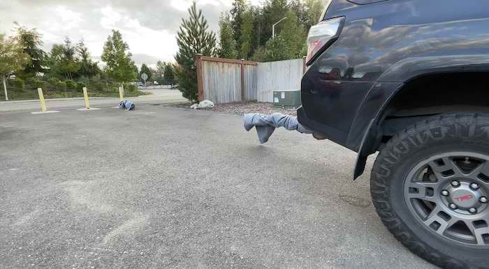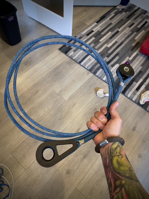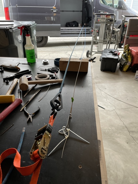 REMOVE CONSTRUCTION STRETCH - Once all six stays were complete there was one final step. Dux is pre-stretched at the factory. When it is spliced the fibres loosen and they must be tensioned again to restore the stretched length. John said that for a SJ23, based on its displacement and righting moment, the 5mm Dux was overkill. I shouldn’t have to pretension these again. But… “anything worth doing is worth over-doing,” so we hitched them up between our 4Runner and some bollards at the end of our alley. We had one spare length of Dyneema that I wanted to use as a proof test, so I hooked that one up first and pull tested it. We ended up breaking the tire loose on the 4Runner! This is a screen grab from the video showing the setup for removing the compression stretch.