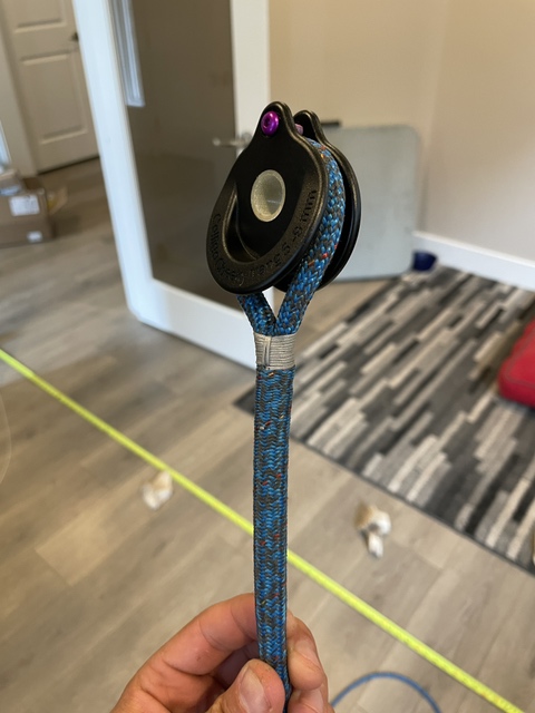 TECHNORA SLEEVE to PROTECT DYNEEMA from UV - To use the Technora chafe sleeve over Dyneema I had to make a covered eye splice instead of the standard locking splice recommended by Colligo Marine. Pulling the Technora sleeve over the eye splice was a bear. The first prototype took me 3-4 hours of swearing and sweating. I thought of abandoning my plan to cover the new rigging, but then it occurred to me that some tension might help. So I tensioned the rigging between my workbench and the tie down in my van (because I could move the van to accommodate the different lengths) and it worked like a charm. Now I was down to about 30 minutes per termination (with a total of 12 to do, two per stay).