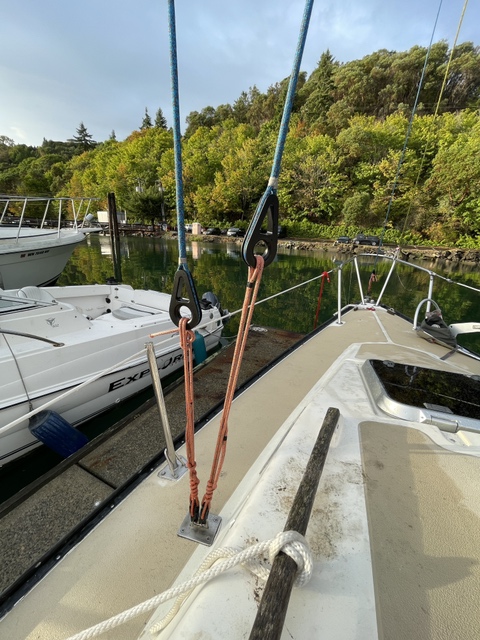 Goodpain is now equipped with Dyneema shrouds, backstay and forestay. She has several hanked on headsails using brass hanks, albeit highly polished with a Dremel Tool to eliminate burrs that can damage the Dyneema forestay. In the future the brass hanks may be replaced with soft shackles. They are a little slower to install but will yield other benefits.