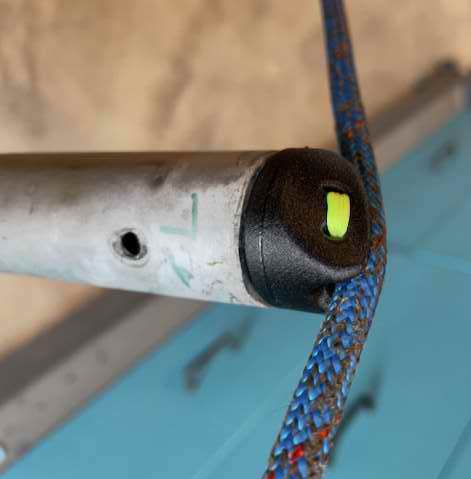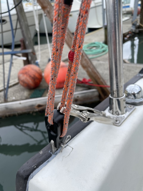 To douse a jib, we install a dousing line (Tech Tip F11) to the sail when it’s rigged. It’s a 5mm covered line with a small stainless steel carabineer spliced to the end. The carabineer hooks onto the halyard shackle. From there, the line goes through a block on the foreword most hole of the toe rail, then aft through some fairleads to a cam cleat in the cockpit. It is left