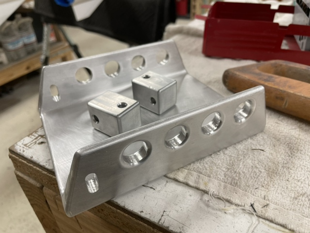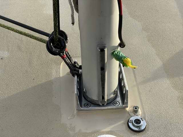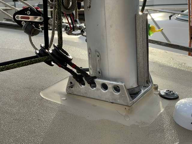 While I was at it, I replaced the mast step plate with one I machined a few months ago. I also fabricated a new gooseneck with a spare. To avoid pulling tension on bolts through the deck and to use the compression strength of the mast itself, I wanted a mast step with integral attachments for halyard fairleads. I found a piece of standard aluminum C-channel that is the perfect size. Holes were drilled through each side, and I did some end milling for sex appeal, flats for the spacers, then followed with sanding and polishing and it was ready to rock.